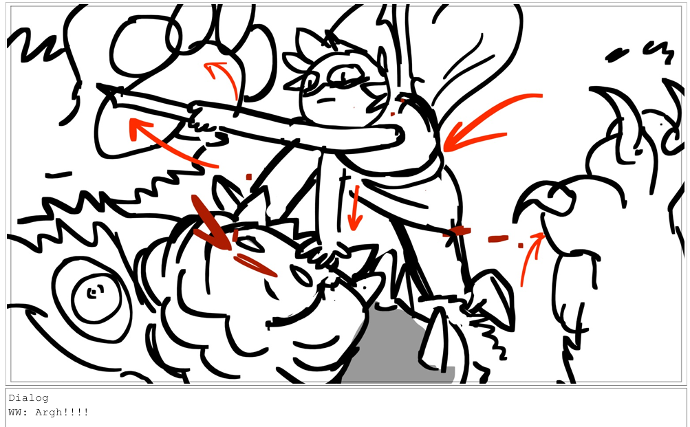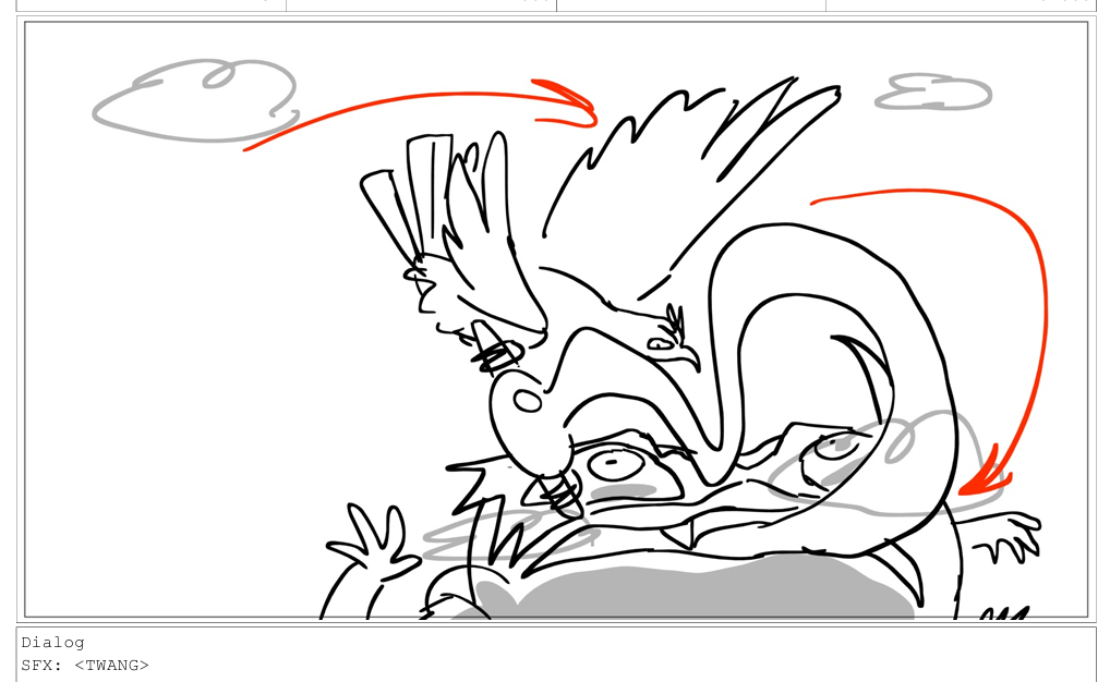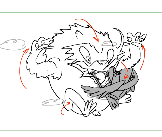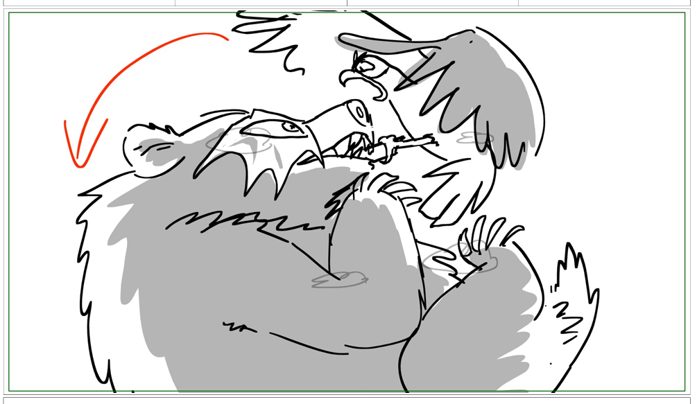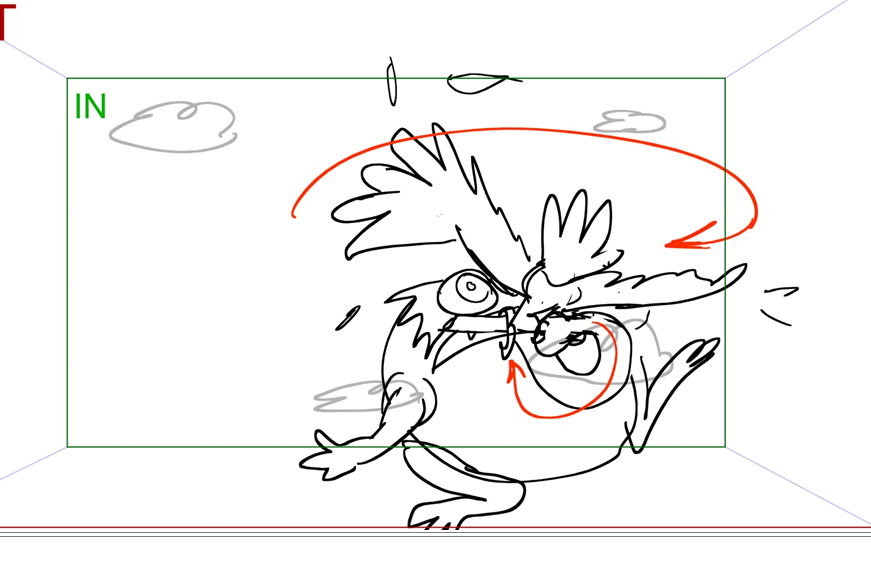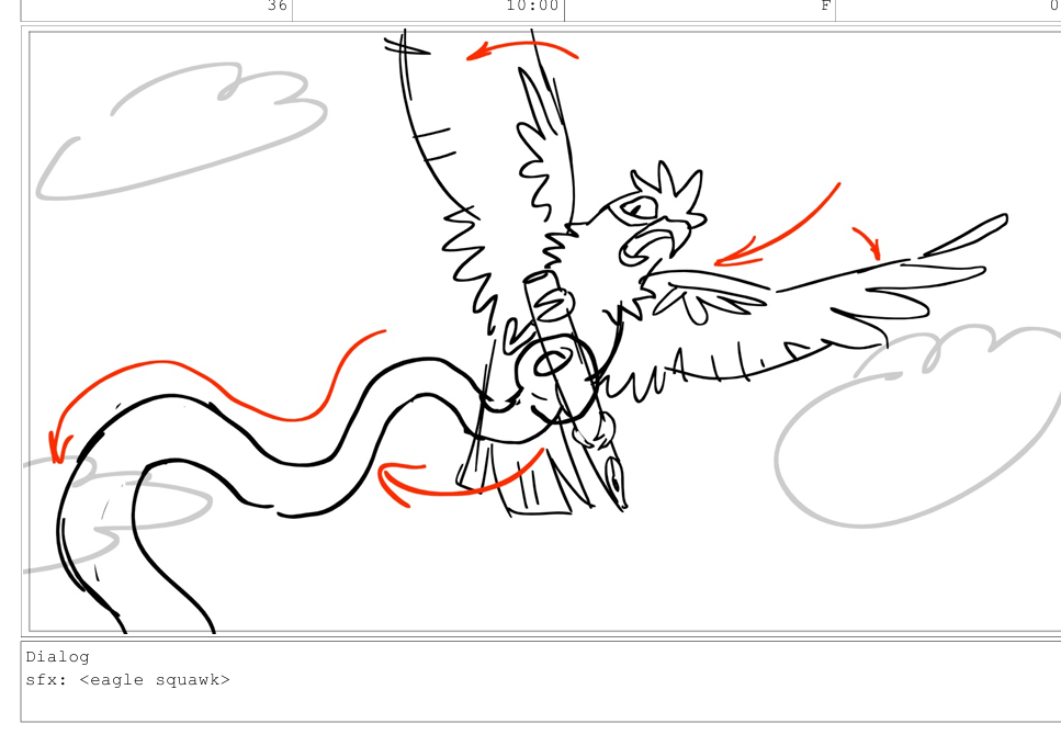 this sequence where they're tumbling and fighting through the sky was fun, I got to draw a lot of crazy poses! drawing different dynamic poses of a bird in flight was something I don't get to do very often but was very fun.