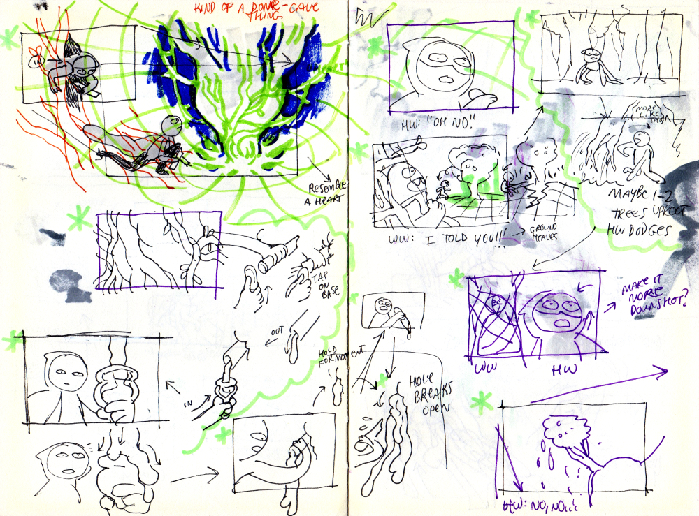 i usually do a very rough paper thumbnail pass the first day so I can look at general layouts very quickly and wrap my mind around the pacing and how much work each episode is going to be. here's a couple pages as example of what that looks like but it does get way messier than this since I usually redraw every thumb in SB Pro by the time the first pitch rolls around. sometimes these paper sketches make it in though
