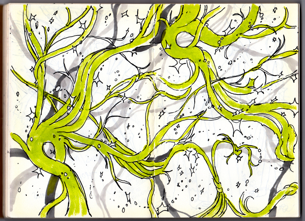 my sketchbook page that became the basis for the look of the Undergrowth. I think it's even the background behind the title of the show in the opening...!